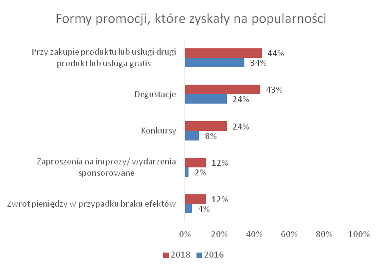 Dwie trzecie Polaków korzystających z promocji przyznaje, że kupienie czegoś po okazyjnej cenie daje dużo satysfakcji. Podobny odsetek deklaruje, że porównuje ceny towarów w różnych sklepach i wybiera najkorzystniejszą ofertę. Ponad połowa badanych twierdzi, że kieruje się podczas zakupów promocjami i stara się wybierać takie produkty, które są akurat w promocji. Istnieje kilka form promocji, które w ciągu ostatnich dwóch lat zyskały na popularności wśród konsumentów. Są to: gratisowe produkty/ usługi, degustacje, konkursy, zaproszenia na imprezy i wydarzenia specjalne oraz zwrot pieniędzy w przypadku braku efektów. Warto zwrócić uwagę, że loterie i konkursy są formami promocji znacznie bardziej popularnymi wśród mężczyzn niż wśród kobiet.
