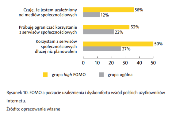 - aż 1/3 osób z wysokim FOMO twierdzi, że czasami czuje się bezużyteczna i uważa, że „jest do niczego”, a 29% z nich chciałoby mieć więcej szacunku dla samego siebie. Takie deklaracje zaobserwowano u ok. 1/6 osób z grupy przeciętnych internautów (np. za bezużytecznych uważa się tu 17% z nich);