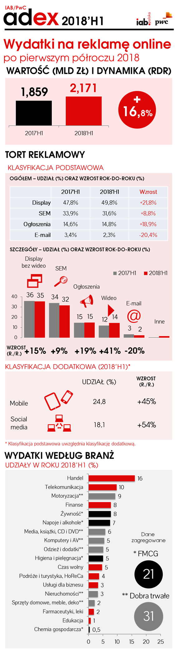 W drugim kwartale 2018 roku utrzymało się tempo rozwojowe (+17%) obserwowane w pierwszych trzech miesiącach roku (16%). Przełożyło się to na półroczny indeks na poziomie 17%. Jeśli dynamika wzrostu utrzyma się na zbliżonym poziomie, koniec roku powinien zakończyć się rekordową wartością przekraczającą 4,6 mld zł. Wynik ten wydaje się wysoce prawdopodobny ze względu na dobre prognozy gospodarcze. Coraz bardziej realny staje się także scenariusz, zgodnie z którym na przełomie roku 2018 i 2019 dojdzie do historycznego punktu zwrotnego w obrazie rynku reklamowego, kiedy to łączne wydatki na wszystkie formaty reklamy cyfrowej przekroczą wydatki na telewizję, co sprawi, że reklama cyfrowa stanie się największym medium.