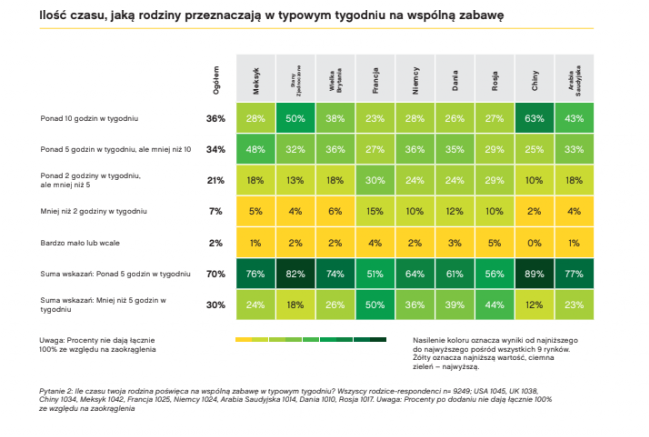 Raport ujawnia związek między godzinami spędzonymi na wspólnej zabawie a szczęściem rodzin. Dziewięć rodzin na 10 (88%), które bawią się razem przez 5 godzin tygodniowo lub więcej, twierdzi, że są szczęśliwe, podczas gdy wśród tych, którzy bawią się mniej niż 5 godzin tygodniowo, tylko 7 na 10 (75%) twierdzi, że są zadowoleni. Czas poświęcany na zabawę jest mocno ograniczony – prawie jedna trzecia rodzin (30%) spędza razem mniej niż 5 godzin tygodniowo. Jedna na 10 (10%) bawi się mniej niż dwie godziny.