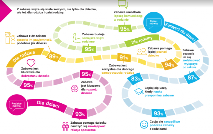 Dorośli i dzieci w równym stopniu odczuwają korzyści płynące ze wspólnej zabawy. Rodzice twierdzą, że jest ona dobra dla ich własnego dobrego samopoczucia (91%) i szczęścia (72%), a nawet pomaga im się bardziej zrelaksować (86%), a także zacieśniać więzi z dziećmi (64%). Prawie wszystkie dzieci biorące udział w badaniu potwierdzają, że zabawa sprawia, iż czują się szczęśliwe (93%) i pomaga im się zrelaksować po długim dniu w szkole (87%).