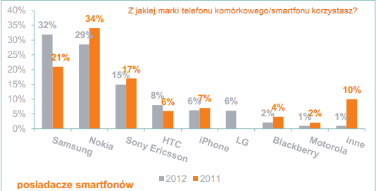 Posiadacze smartfonów to awangarda, która wyznacza trendy popularności na rynku marek telefonów komórkowych. Dobrze te zmiany ilustruje wykres pokazujący, jak w 2012 zmieniła się popularność marek w porównaniu z 2011 rokiem. Obecnie najpopularniejszą marką jest Samsung posiada ją blisko jedna trzecia posiadaczy smartfonów, na drugim miejscu jest Nokia (29 proc.). W ciągu roku Samsung zwiększył swój udział w rynku smartfonów o 11 pkt. proc. a Nokia zmniejszyła o 5 pkt. proc. Zwraca także uwagę wzrost znaczenie marki LG, w ubiegłym roku jeszcze nie uwzględnionej w rankingu.