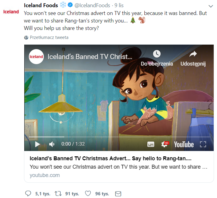 Brytyjska sieć supermarketów Iceland postanowiła swoich tegorocznych reklamach świątecznych pochwalić się faktem, że rezygnuje z dodawania oleju palmowego do produktów swoich marek własnych. By nadac temu znaczenia, marka chciała wykorzystać spot organizacji Greenpeace, w którym przedstawiono krótką historię dziewczynki i orangutana grasującego w jej pokoju.