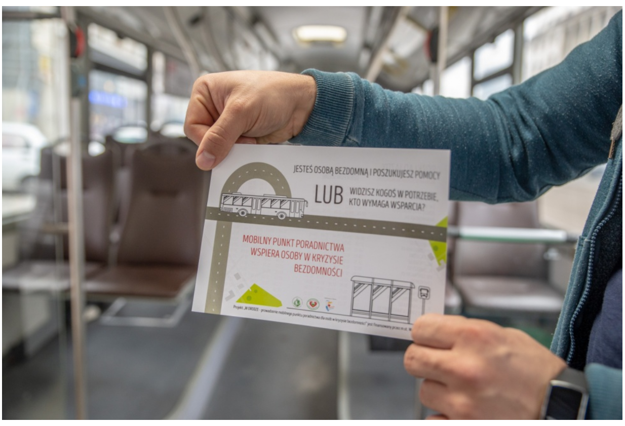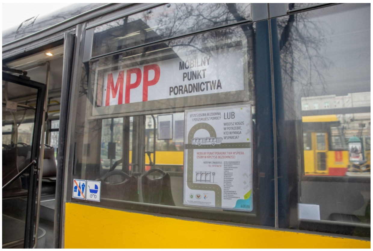 Mobilny Punkt Poradnictwa, czyli autobus dla osób w kryzysie bezdomności, pełni ważną rolę w udzielaniu pomocy doraźnej. Pojazd umożliwia osobom bezdomnym przemieszczanie się pomiędzy schroniskami, noclegowniami, jadłodajniami, ogrzewalniami, punktami pomocy medycznej oraz łaźnią. Co więcej, autobus dociera także do dworców kolejowych, miejsc, gdzie przebywają osoby bezdomne, oferując możliwość transportu do placówek, ciepły napój oraz poradnictwo.