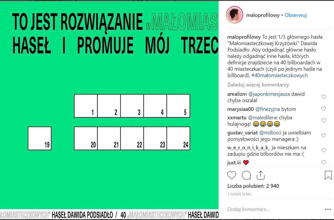 Aby odgadnąć główne hasło, trzeba najpierw znaleźć hasła z 40 billboardów w różnych miastach Polski. Trzeba przyznać, że pomysłów Dawidowi nie brak 😉
