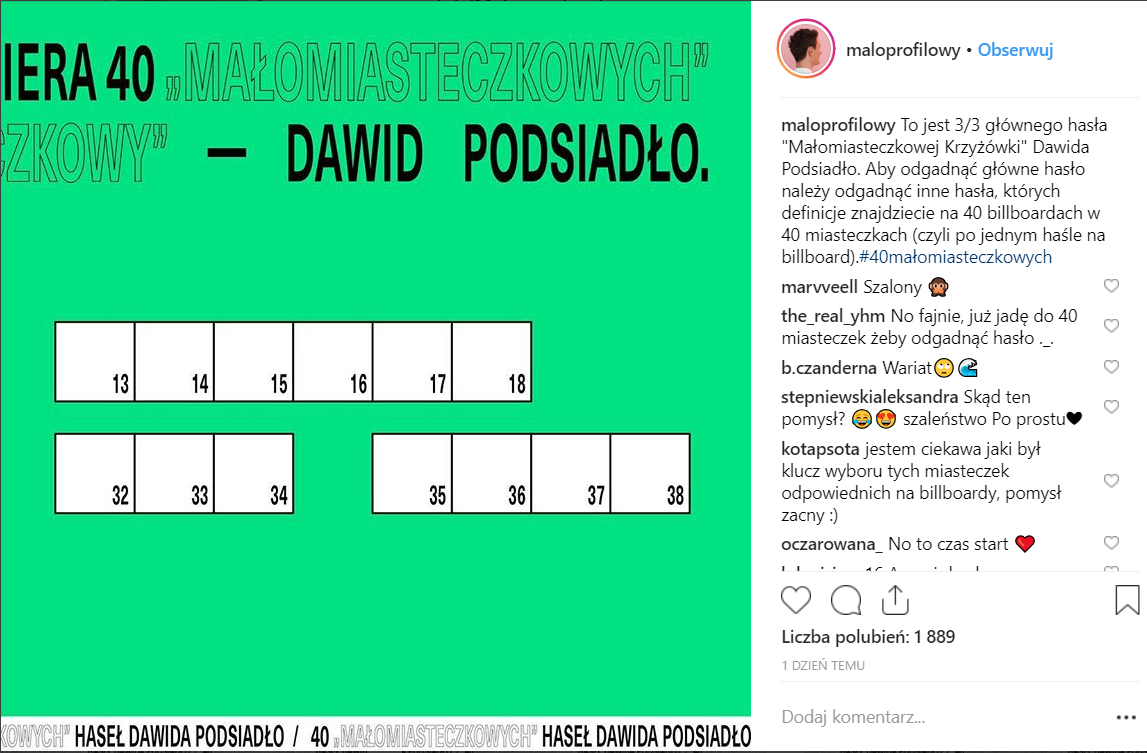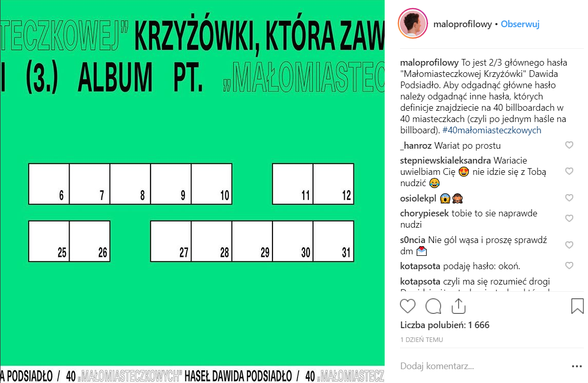 Najpierw był zielony kiosk w centrum Warszawy, a teraz 40 Małomiasteczkowych krzyżówek na 40 billboardach w 40 miastach i miasteczkach w Polsce. Jest to kolejna część akcji promującej nowy album Dawida Podsiadło „Małomiasteczkowy”.