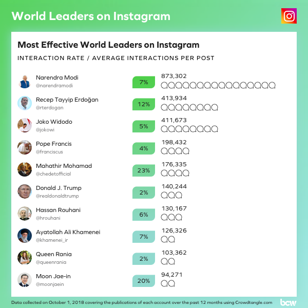 Biorąc jednak pod uwagę liczbę interakcji pod jednym postem, premier Indii jest najbardziej efektywnym światowym przywódcą na Instagramie – każdy z jego 80 postów uzyskał średnio 873 302 interakcji. Drugie miejsce zajmuje prezydent Turcji z liczbą 413 934 aktywności na jeden post, a tuż za nim uplasował się prezydent Indonezji, Joko Widodo, którego posty osiągają średnio 411 673 interakcji.