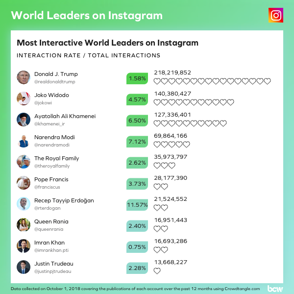 Prezydent Stanów Zjednoczonych Donald Trump prowadzi w rankingach pod względem liczby wszystkich interakcji (komentarze i polubienia). W ciągu ostatnich 12 miesięcy, profil @realDonaldTrump osiągnął ponad 218 miliona interakcji, trzy razy więcej niż indyjski premier Narendra Modi, który co prawda ma więcej obserwujących, jednak pod swoimi 80 zdjęciami i wideo zebrał w ostatnim roku tylko 69 milionów interakcji.