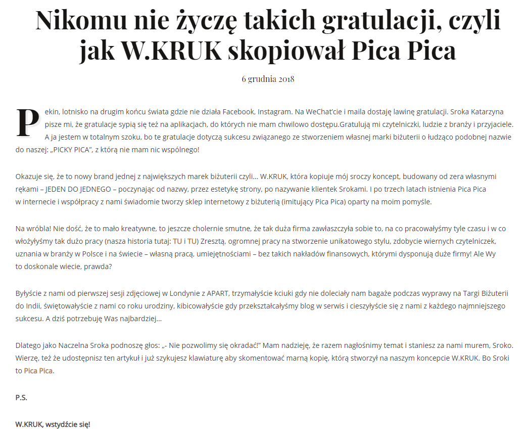 Dziś, 6 grudnia br., w portalu pojawił się wpis Agaty Jankowiak, która napisała, że firma W.Kruk wprowadziła na rynek nową markę Picky Pica, której koncept jest bardzo zbliżony do portalu Pica Pica. Co więcej, klientki nowego brandu biżuteryjnego są określane mianem Srok, tak jak czytelniczki portalu Agaty Jankowiak.