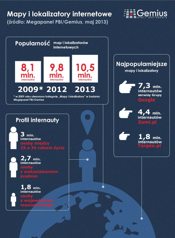 Najpopularniejszymi witrynami, dzięki którym internauci mogą na bieżąco przeglądać mapy i lokalizować poszukiwane miejsca są, podobnie jak przed rokiem, serwisy Grupy Google (7,3 mln internautów), Zumi.pl (4,4 mln) i Targeo.pl (1,8 mln).
