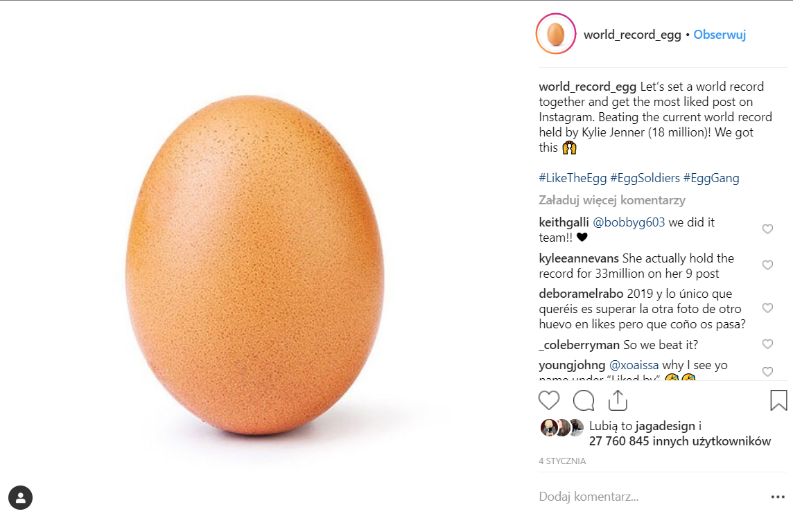 27,7 mln – tyle polubień posiada zdjęcie jajka na profilu World Record Egg. Tym samym bezsprzecznie jest ono najpopularniejszym zdjęciem na Instagramie.