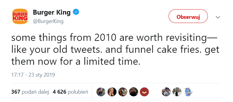 Jak można było się spodziewać, nie był to przypadek. Lajkowanie tweetów z 2010 roku było związane z przywróceniem przez Burger Kinga tzw. frytkowych faworków, czyli funnel cake fries, które były dostępne w ofercie marki właśnie w 2010 roku.
