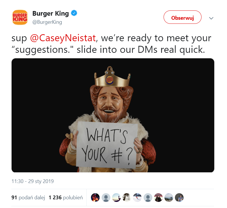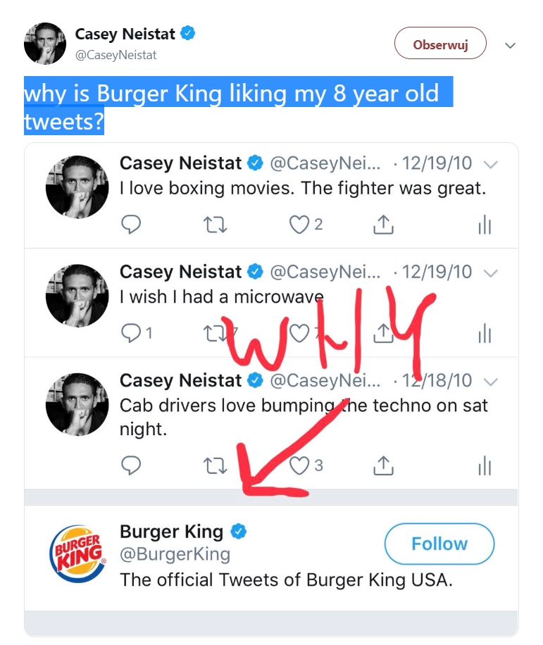 Wszystko zaczęło się od tego, że Burger King polubił trzy tweety youtubera z 2010 roku. Ten zdezorientowany zrobił screen tych kilku postów wraz z lajkami od marki i umieścił na swoim Twitterze z dopiskiem „why is Burger King liking my 8 year old tweets?”. Krótko po tym okazało się, że Casey Neistat nie był jedyną osobą, której się to przytrafiło.