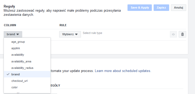 Reguły Niestandardowe pozwalają tworzyć bardzo rozbudowane zestawy reklam. Rozwijane menu pozwoli ci przejrzeć wszystkie dostępne możliwości. Znajdziesz tam przykładowo opcję utworzenia zestawu zawierającego produkty jednej marki (bardzo przydatne w przypadku sklepów multibrandowych).