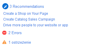 Po dodaniu katalogu możesz otrzymać ostrzeżenia w postaci żółtych znaczników lub błędy w postaci czerwonych. Twój katalog będzie działał, nawet jeżeli widzisz kilka ostrzeżeń – są to elementy, które najlepiej poprawić, by zwiększyć skuteczność działań. Błędy musisz natomiast wyeliminować, aby wszystko poprawnie działało.