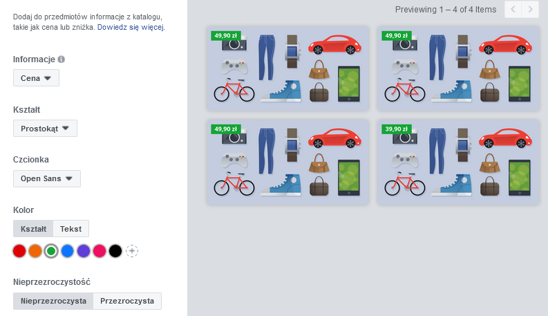 - availability – informacja o tym, czy dany produkt jest aktualnie dostępny. Facebook przewiduje tutaj kilka możliwości: in stock, out of stock, preorder, available for order, discontinued.