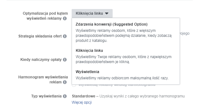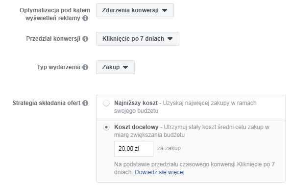 Warto tu zaznaczyć, że ten rodzaj optymalizacji jest zalecany, jeśli dziennie z reklam dynamicznych uzyskujesz 15 konwersji w ciągu 1 dnia od kliknięcia reklamy. W innym przypadku, zdecyduj się na opcję pod kątem kliknięć linku.