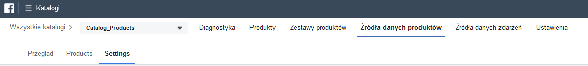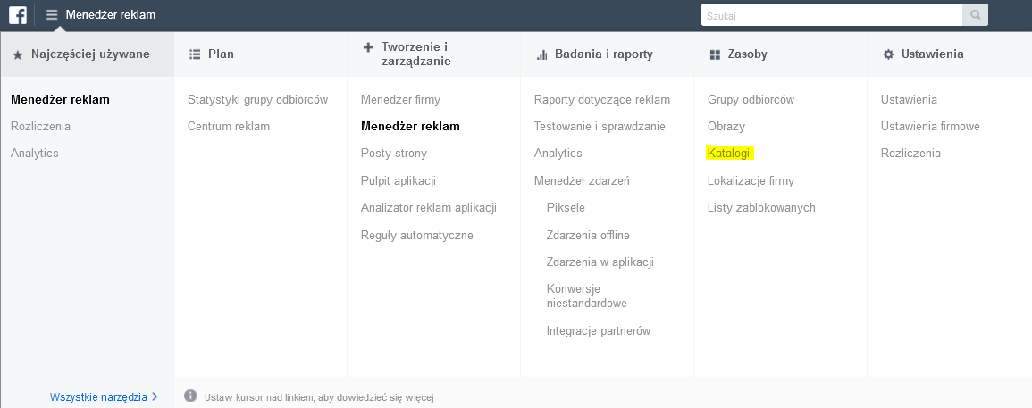 Katalog produktów możemy przygotować, przechodząc w Menedżerze reklam do zakładki Katalogi: