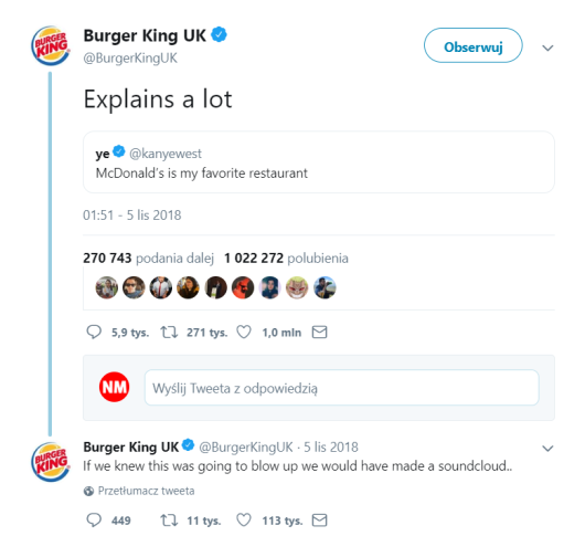 Kanye West zadeklarował na Twitterze, że jego ulubioną restauracją jest McDonald’s. Burger King odpowiedział mu na to w typowy dla siebie sposób, co docenili internauci na całym świecie.