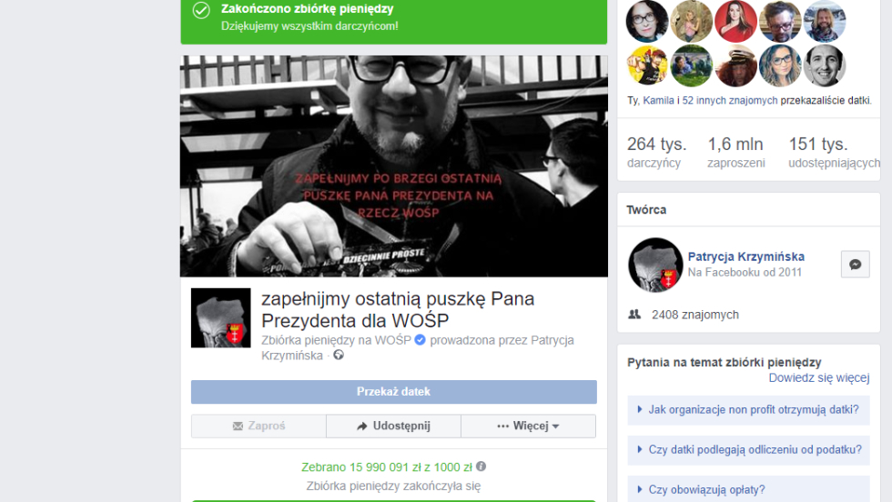 Po śmierci śp. Prezydenta Gdańska Pawła Adamowicz użytkownicy Facebooka hojnie przekazywali datki do „ostatniej puszki Pana Prezydenta dla WOŚP” w internetowej zbiórce pieniędzy. Początkowo celem było zebranie 1000 złotych, ostatecznie zaś udało się zebrać prawie 16 mln złotych.