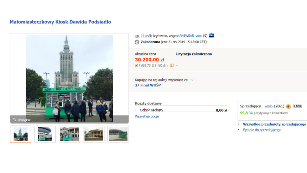 Pamiętacie nietypowy, zielony kiosk Dawida Podsiadło, który pojawił się 19 października 2018 roku przed Pałacem Kultury i Nauki w Warszawie? W tym roku trafił on na aukcję WOŚP. Jak się okazało, ostatecznie to firma ANSWEAR.com wylicytowała go za ponad 30 tys. złotych.