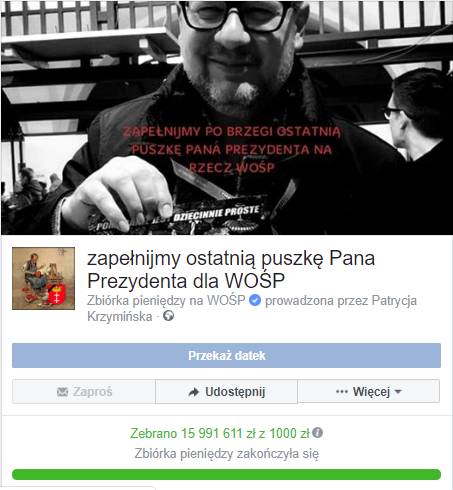 – Dzięki wspaniałej społeczności Facebooka „Zapełnijmy ostatnią puszkę Pana Prezydenta dla WOŚP” jest największą zbiórką w historii platformy zorganizowaną w Europie oraz w całym regionie EMEA (Europa, Bliski Wschód, Afryka). Jesteśmy pod wielkim wrażeniem tego, jak ludzie z całego świata wspólnie zaangażowali się w tę ważną inicjatywę i tego, jak nasze narzędzia pomogły w mobilizacji tak imponującej energii i dobrej woli dla realizacji szlachetnego celu. Odkąd wprowadziliśmy narzędzia umożliwiające zbieranie pieniędzy na cele charytatywne w 2015 roku ludzie z całego świata zgromadzili za pomocą przycisku „Przekaż datek” na Facebooku ponad miliard dolarów, ponad 20 milionów ludzi utworzyło zbiórkę lub przekazało na nią pieniądze na Facebooku. Ponad milion organizacji non-profit może otrzymywać darowizny za pośrednictwem Facebooka. W pierwszym roku od uruchomienia zbiórek urodzinowych zebrano ponad 300 milionów dolarów na sprawy, które są dla nich ważne w pierwszym roku od uruchomienia urodzinowych zbiórek pieniędzy na Facebooku – mówi Robert Bednarski, dyrektor Facebooka na Europę Środkowo-Wschodnią.