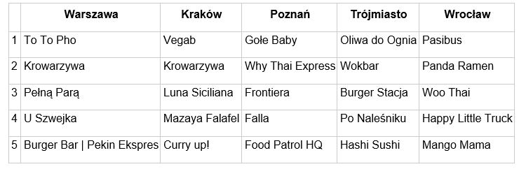 Wśród restauracji wiodących prym w Uber Eats, w Warszawie na pierwsze miejsce wybija się azjatycka To To Pho, w Krakowie – Vegab, w Poznaniu – Gołe Baby, w Trójmieście – Oliwa do Ognia, a we Wrocławiu – Pasibus. Oto lista 5 najlepszych restauracji na platformie Uber Eats w 2018 roku, według ocen użytkowników aplikacji: