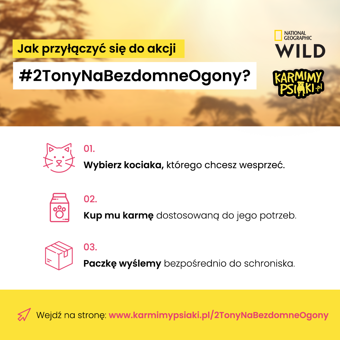 „Miesiąc z wielkimi kotami” to doroczna inicjatywa National Geographic Wild, która ma na celu budowanie świadomości na temat wielkich kotów – pięknych drapieżników, spośród których coraz więcej znajduje się na liście zagrożonych gatunków. National Geographic Wild zwraca także uwagę na los kotów żyjących bliżej nas – w polskich schroniskach. Dlatego wraz z Karmimy Psiaki (należącą do Fundacji Sarigato) kanał wystartował z akcją zbiórki karmy #2TonyNaBezdomneOgony. Dołączyć do niej można wchodząc na stronę www.karmimypsiaki.pl/2tonynabezdomneogony, gdzie wystarczy wybrać bezdomnego kota i kupić mu karmę specjalnie dostosowaną do jego potrzeb.