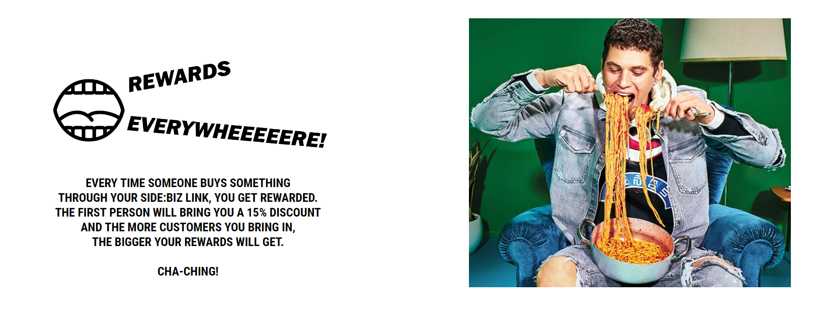 Za utworzenie konta na stronie marki Diesel, followers nie tylko otrzymuje zniżkę na pierwsze zakupy, ale również dostaje do swojej dyspozycji unikalny kod, który może przekazywać innym. Za każdym razem, gdy dana osoba zrobi zakupy na stronie brandu używając owego kodu, followers otrzymuje kolejne zniżki na swoje zakupy. Im więcej osób skorzysta ze specjalnego kodu, tym jego właściciel będzie mieć większą zniżkę. Proste 😉