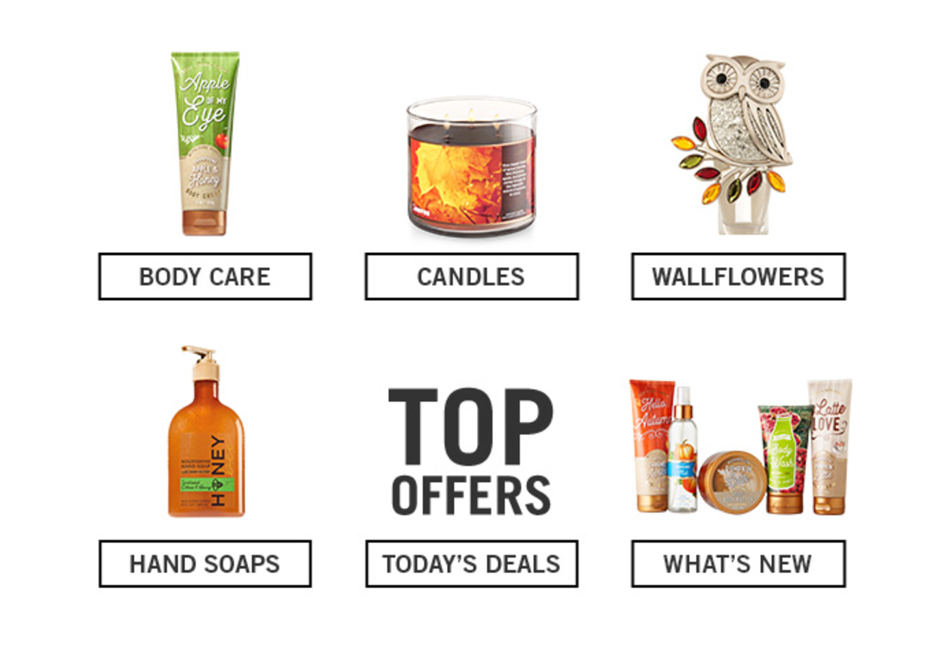 Fragment e-maila od marki Bath&Body Works prezentujący różne kategorie produktów