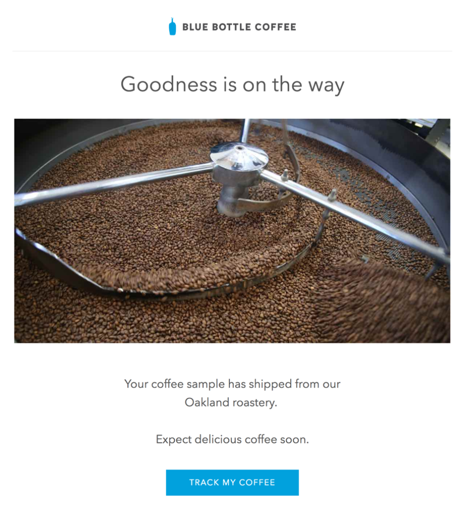 Oto e-mail transakcyjny od marki Blue Bottle Coffee z zachętą do śledzenia przesyłki: