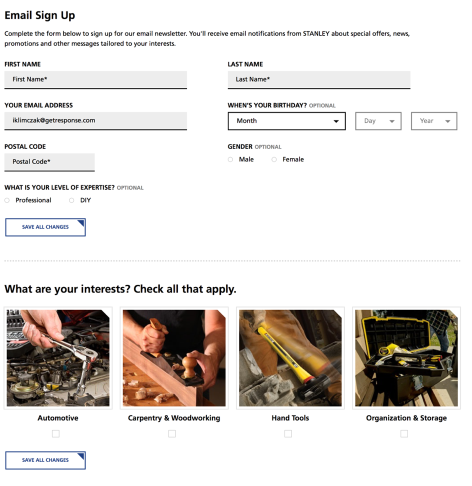 Długie formularze nie muszą sprawiać kłopotu. Aby odbiorcy łatwiej było taki formularz wypełnić, możesz wykorzystać checkboxy. Oto przykład od marki Stanley: