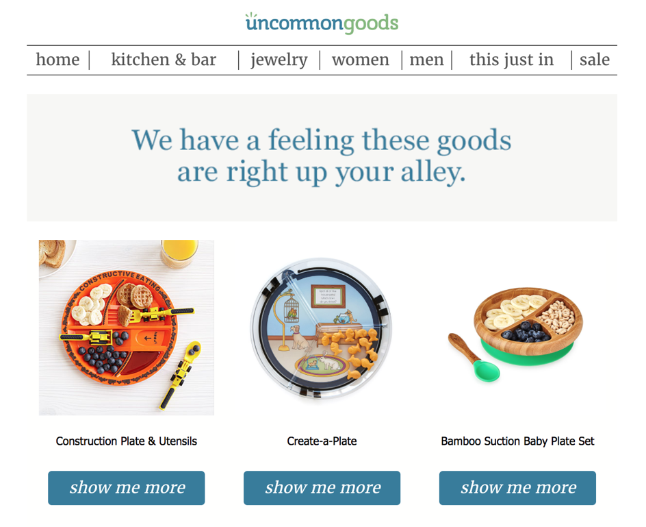 Na podstawie klikniętych w wiadomości linków oraz odwiedzonych adresów URL, możesz przeprowadzić precyzyjnie targetowane kampanie promujące ostatnio oglądane przez odbiorców produkty. Oto fragment wiadomości od marki UncommonGoods, w którym przypomniano mi, jakie produkty oglądałem w newsletterze i na stronie: