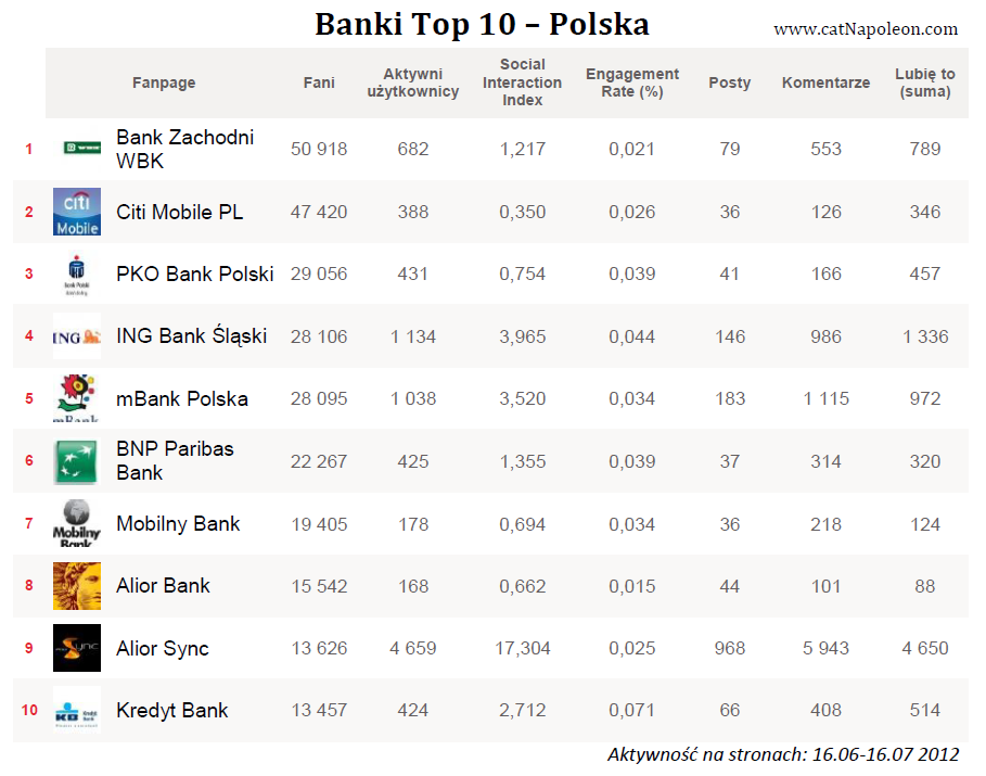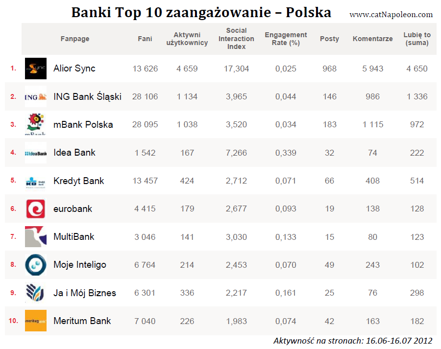 W lipcu najszybciej nowych użytkowników zdobywa w Polsce Alior Sync. To bank internetowy nowej generacji, który daje możliwość m. in. realizacji przelewów na Facebooku – wystarczy być czyimś znajomym, by przelać mu do 50 zł. Innowacyjna aplikacja plus duża kampania reklamowa zostały życzliwie przyjęte przez internautów. Według modułu analitycznego catNapoleon.com od początku lipca (pierwsze dwa tygodnie) fan page banku zwiększył się o 2 tys. nowych użytkowników. To najlepszy wynik w polskiej branży bankowej na Facebooku.
