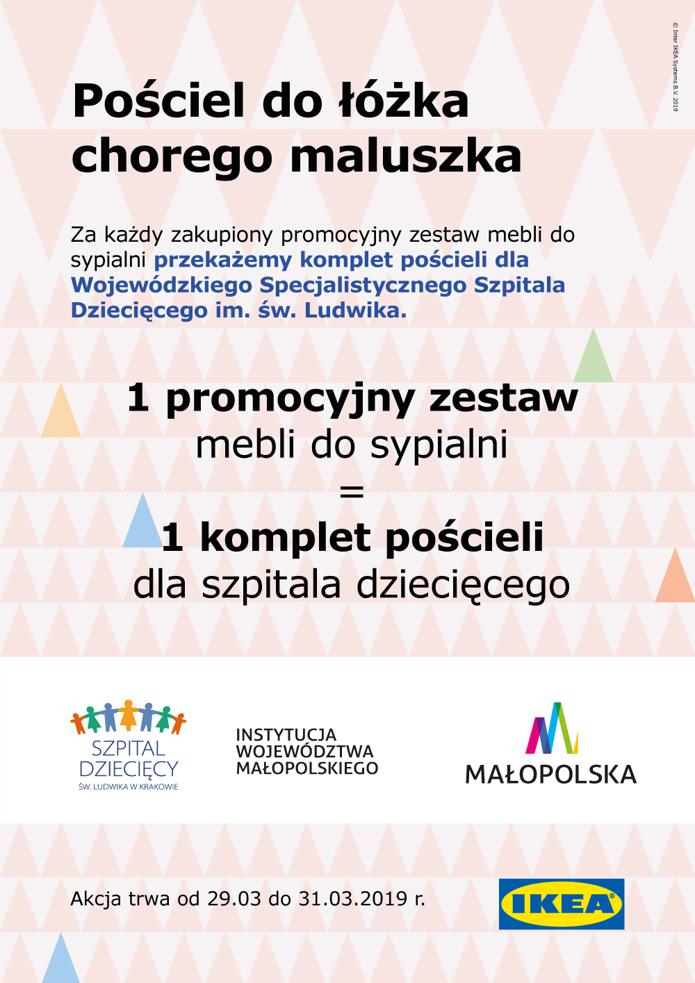 Jeżeli jesteście akurat na etapie urządzania sypialni, robiąc zakupy w najbliższy weekend, dodatkowo pomożecie wyposażyć szpitalne oddziały w nowe komplety pościeli – zachęcają przedstawiciele IKEA Kraków. Akcja potrwa od piątku do niedzieli i dotyczy zestawów mebli do sypialni w promocyjnych cenach. Zebrane w ten sposób komplety pościeli trafią na Odział Psychiatrii Dzieci i I Oddział Kliniczny Dzieci Starszych Wojewódzkiego Specjalistycznego Szpitala Dziecięcego im. św. Ludwika. Tylko w 2018 roku na tych oddziałach hospitalizowanych było ponad 1 800 dzieci.