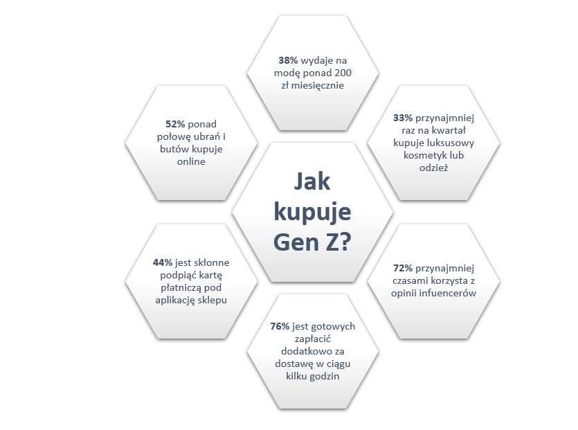 Jak wynika z badania przeprowadzonego na zlecenie Accenture i FashionBiznes.pl, Generacja Z różni się w swoich zachowaniach zakupowych od starszych pokoleń. Dużo chętniej kupuje online – już ponad połowa najmłodszych konsumentów dokonuje większości swoich zakupów z takich kategorii jak moda czy elektronika w sieci. Młodzi są też bardziej skłonni, by dodatkowo zapłacić za dostawę w ciągu kilku godzin – tak deklaruje trzech na czterech badanych z Generacji Z.