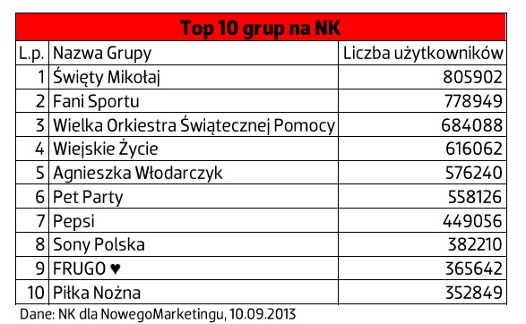 Najwięcej użytkowników na NK zgromadził… Święty Mikołaj (ponad 805 tys.), Fani Sportu (grupa nieoficjalna) i Wielka Orkiestra Świątecznej Pomocy (ponad 680 tys. osób). Wśród najpopularniejszych grup na NK są także te prowadzone dla marek Pepsi, Sony Polska i Frugo.