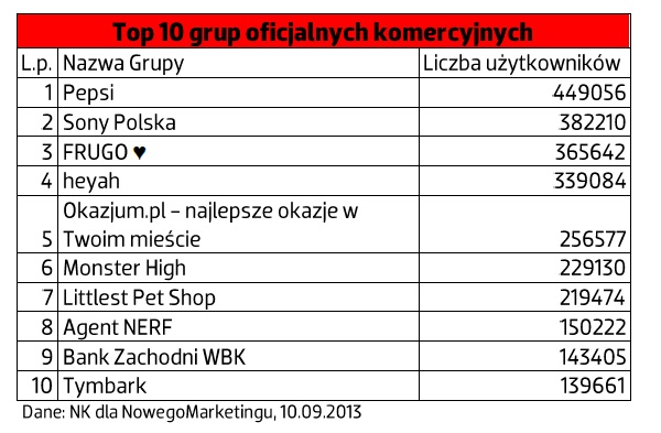 Najpopularniejszą markową grupą oficjalną na NK jest grupa Pepsi, która w momencie przygotowywania zestawienia posiadała 449056 użytkowników (dla porównania liczba fanów Pepsi na Facebooku to 510499), co oznacza przyrost o 114,89% w porównaniu do poprzedniego roku (zmiana dla FB 150,81%). Dynamika zmiany liczby użytkowników grupy lidera ubiegłorocznego topu marki Sony Polska wynosi dla NK 24,31% (382210 vs 307457 osób) a na FB 127,39% (190813 vs 83914 w maju 2013 r.) O ponad 110% zwiększyła się liczebność oficjalnej grupy Frugo, do której aktualnie należy ponad 365 tys. osób (na FB marka zgromadziła 713359 fanów). Na czwartej pozycji w top 10 uplasowała się grupa marki Heyah, licząca 339084 (wzrost o 23,31% na NK i 169% na FB – aktualnie 643681 fanów). Ciekawym przykładem jest zajmująca piąte miejsce grupa Okazjum.pl posiadająca 256577 użytkowników (przy czym fanów na FB w liczbie 3680). Silne grupy odbiorców na NK mają także nieobecne na Facebooku marki Monster High (wzrost liczebności o 160% w odniesieniu do maja 2012 roku), Littlest Pet Shop (założona we wrześniu 2012 roku) i Agent NERF. Zestawienie największych oficjalnych grup komercyjnych na NK zamyka marka Tymbark, której udało się zgromadzić prawie 140 tys. użytkowników (na FB ponad 1,1 mln).
