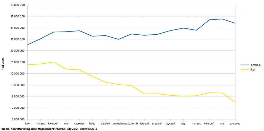 Według badania Megapanelu z czerwca 2013 NK miała 7,5 mln real users. W tym samym okresie Facebook osiągnął liczbę 14,4 mln real users. Dlaczego w starciu z Facebookiem o uwagę marketerów NK zostaje daleko w tyle w artykule „Czy marki mają czego szukać na NK?” wyjaśniał Michał Sławiński, Social Media Director, The Digitals: