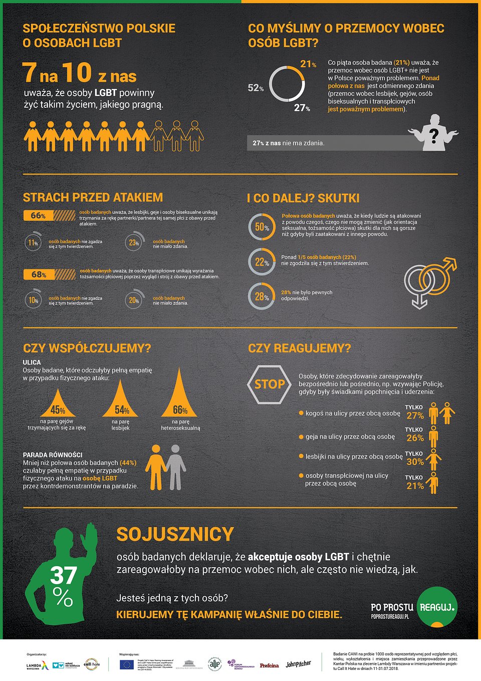 Najbardziej optymistyczna informacja wynikająca z badania dotyczy stosunku do osób LGBT. Większość (70 proc.) osób mieszkających w Polsce uważa, że osoby LGBT powinny żyć tak jak chcą. Choć Polacy stają się coraz bardziej tolerancyjni, nadal nie wiedzą jak się zachować gdy są świadkami przemocy wobec osób LGBT.
