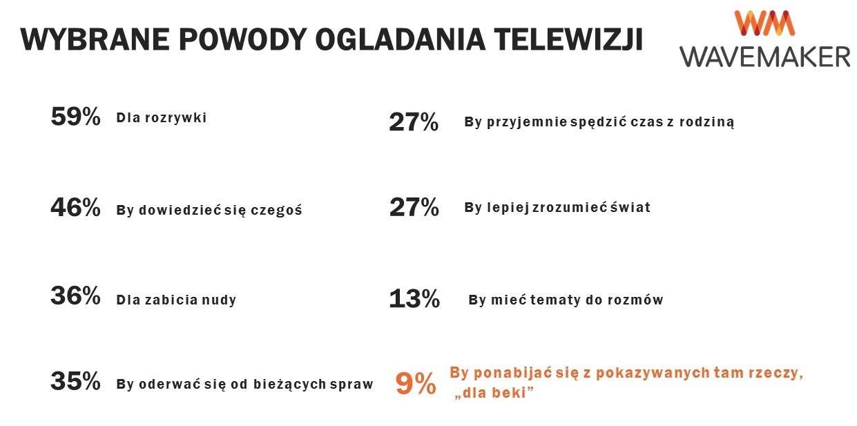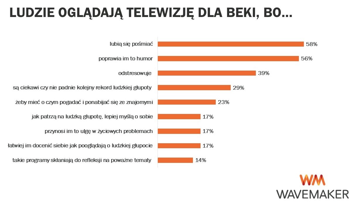 Jak podsumowuje Wavemaker, niewykluczone też, że istnienie grupy widzów oglądających telewizję w prześmiewczym trybie, wpływa na stabilną oglądalność TV w Polsce. Zjawisko oglądania dla beki nie jest wprawdzie nowe, ale w miarę rozwoju telewizji i pojawienia się np. nurtu paradokumentów mogło przybrać na sile.