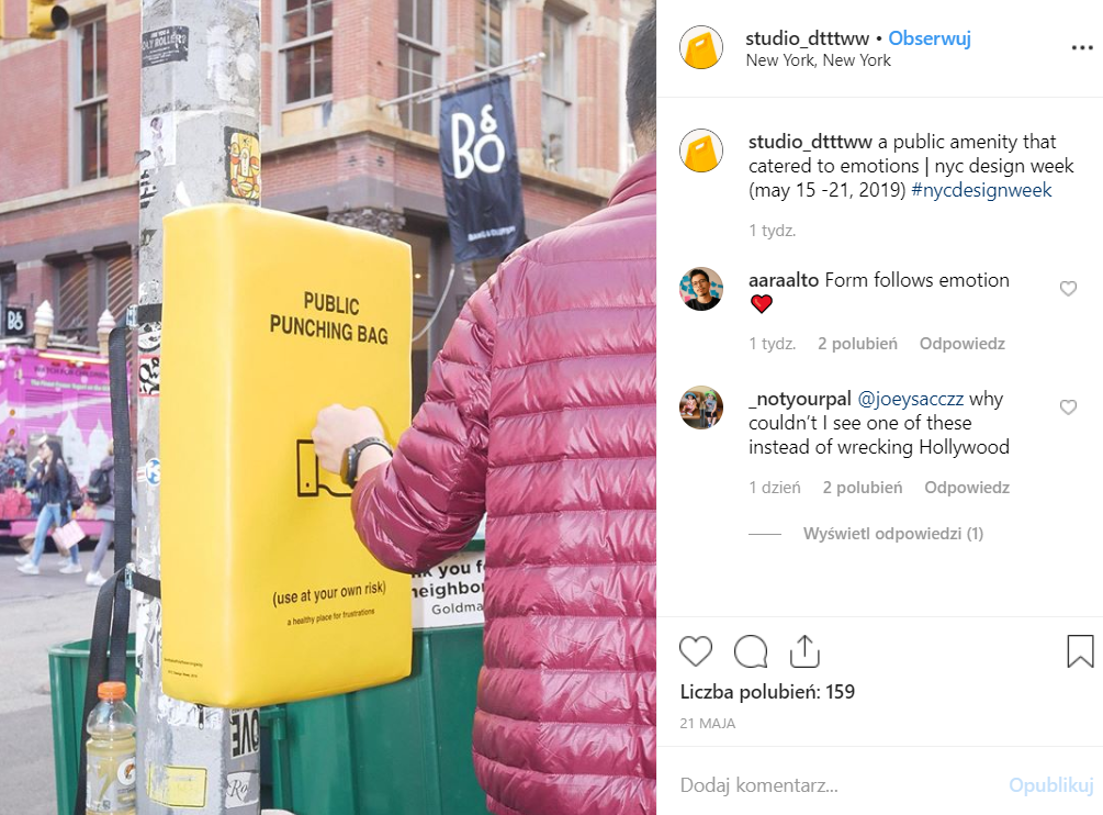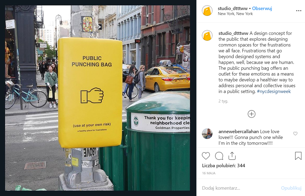 W Nowym Jorku w dzielnicach Soho, Chelsea i Washington Square Park pojawiły się żółte worki treningowe, na których widnieje napis „Public Punching Bag”. Każdy mieszkaniec miasta mógł więc skorzystać z nich do wyładowania swojego stresu oraz frustracji.