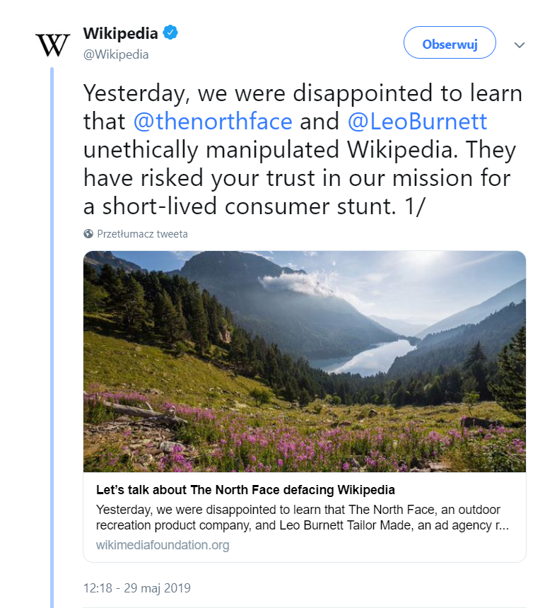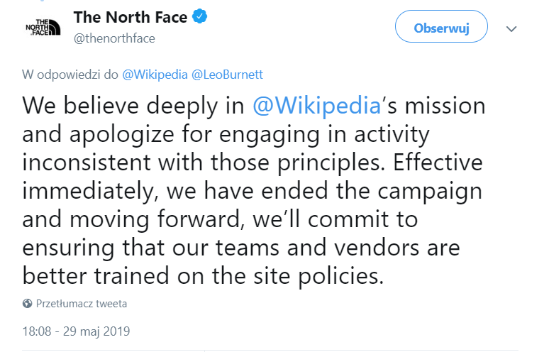Problem w tym, że Wikipedia nic o takowej kampanii nie wiedziała. Gdy tylko sprawa wyszła na jaw, przedstawiciele platformy szybko odcięli się od marki The North Face, m.in. blokując wszystkie konta, z których dokonano zmian zdjęć. Na swoim profilu na Twitterze opublikowali też oświadczenie, w którym nazwali działania brandu i agencji „nieetycznymi” i stwierdzili, że owa kampania naruszyła „misję Wikipedii w dostarczaniu opartych na faktach informacji”.