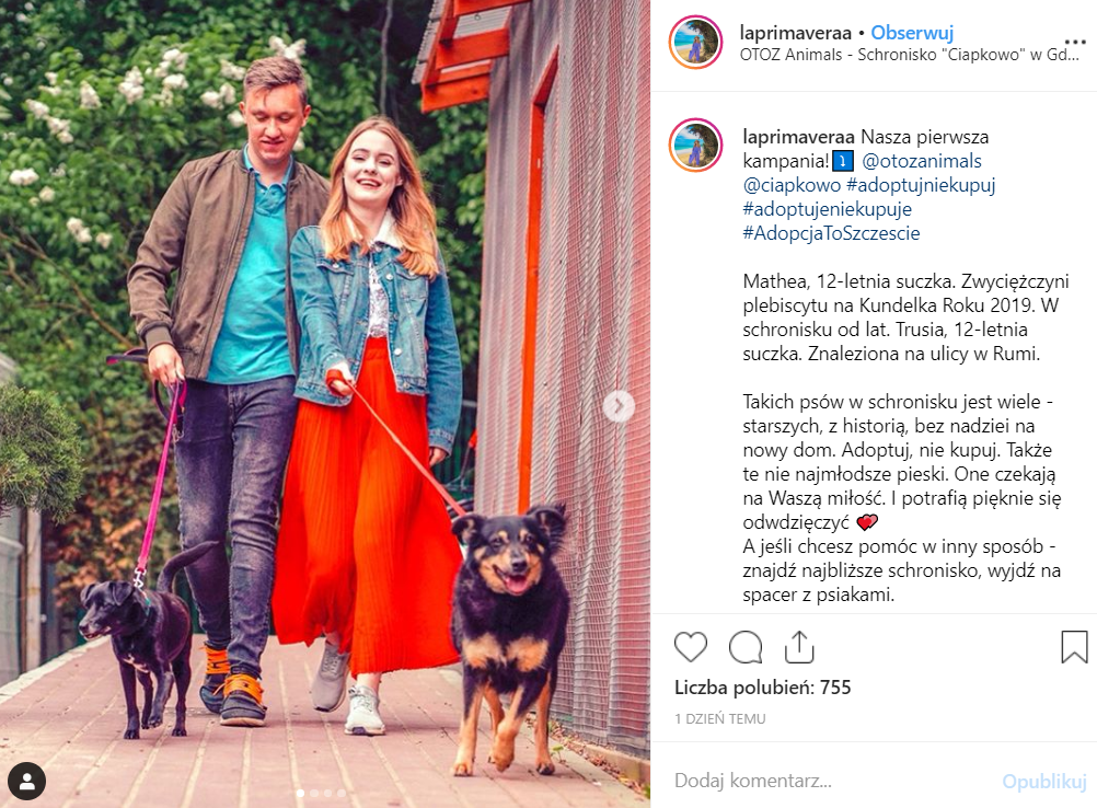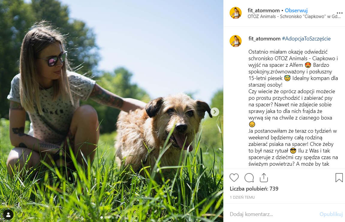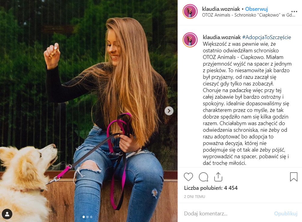 Ci w ramach akcji poświęcili swój czas i wyprowadzili czworonogi na spacer, a następnie na swoich instagramowych profilach zaprezentowali podopiecznych schroniska. Co istotne, dzięki kampanii jeden czworonóg z „Ciapkowa” znalazł już kochający dom.