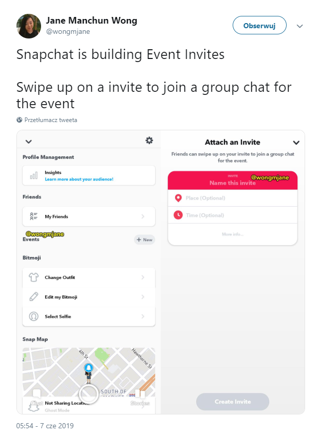 Informacje o tym podała Jane Manchun Wong, która zajmuje się wyszukiwaniem nowych udogodnień w aplikacjach społecznościowych. Na swoim profilu na Twitterze udostępniła screen ze Snapchata, na którym możemy zauważyć nową opcję dotyczącą tworzenia wydarzeń.