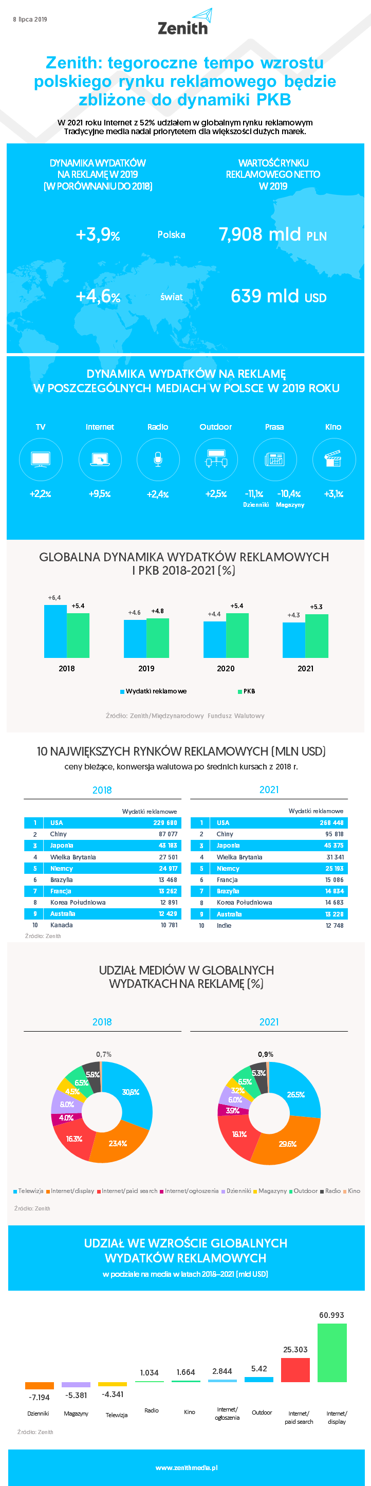 Agencja mediowa Zenith obniżyła swoją prognozę wzrostu polskiego rynku reklamowego w 2019 roku z 5,3% na 3,9%. Wartość rynku wyniesie 7,908 mld PLN netto. Globalne wydatki na reklamę wzrosną w tym roku o 4,6%, a ich suma zamknie się w kwocie 639 mld USD.
