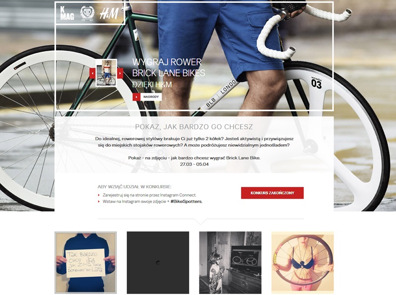Marka H&M w ramach promocji limitowanej kolekcji dla Brick Lane Bikes w dniach 27.03 – 5.04.2013 przygotowała konkurs (case study akcji) – o nagrody walczyły osoby, które zalogowały się na stronie BikeSpotters.pl za pomocą Instagram Connect i opublikowały zdjęcia konkursowe z hashtagiem #BikeSpotters. Do akcji zgłoszono 172 zdjęcia. Treści rozchodziły się wirusowo – łączny zasięg informacji o konkursie szacowany jest na kilkadziesiąt tysięcy osób.