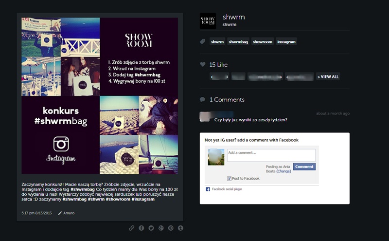 Naszym zdaniem przede wszystkim utrudnione jest promowanie konkursu na Instagramie – poza dodaniem jednego zdjęcia z informacją właśnie na Instagramie, konkurs musieliśmy promować na Facebooku (na Instagramie tego typu zdjęcia 'komercyjne’ z tekstową informacją nie cieszą się dużą popularnością). Ponadto webowa aplikacja nie umożliwia przeglądania konkretnych hashtagów, więc na samym Instagramie ciężko było zobaczyć zdjęcia konkursowe (w tym celu stworzyliśmy sami specjalną stronę na shwrm.pl). I ostatnia rzecz – sposób ustawiania prywatności na Instagramie (nie można zmieniać ustawień prywatności per post, tylko trzeba per konto) powoduje, że mieliśmy sygnały od osób, które opublikowały zdjęcie, lecz było ono prywatne i nie mogliśmy go uwzględnić w konkursie.