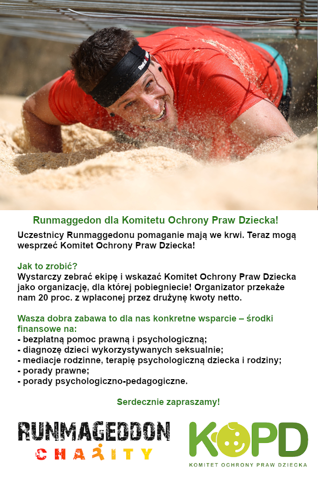 Firmy szukające dla swoich pracowników nowych wyzwań i doświadczeń mogą wykupić pakiety startowe Runmageddonu Charity. Wystarczy zebrać ekipę i wskazać Komitet Ochrony Praw Dziecka jako fundację, dla której pobiegniecie! Organizator przekaże nam 20 proc. z wpłaconej przez drużynę kwoty netto.