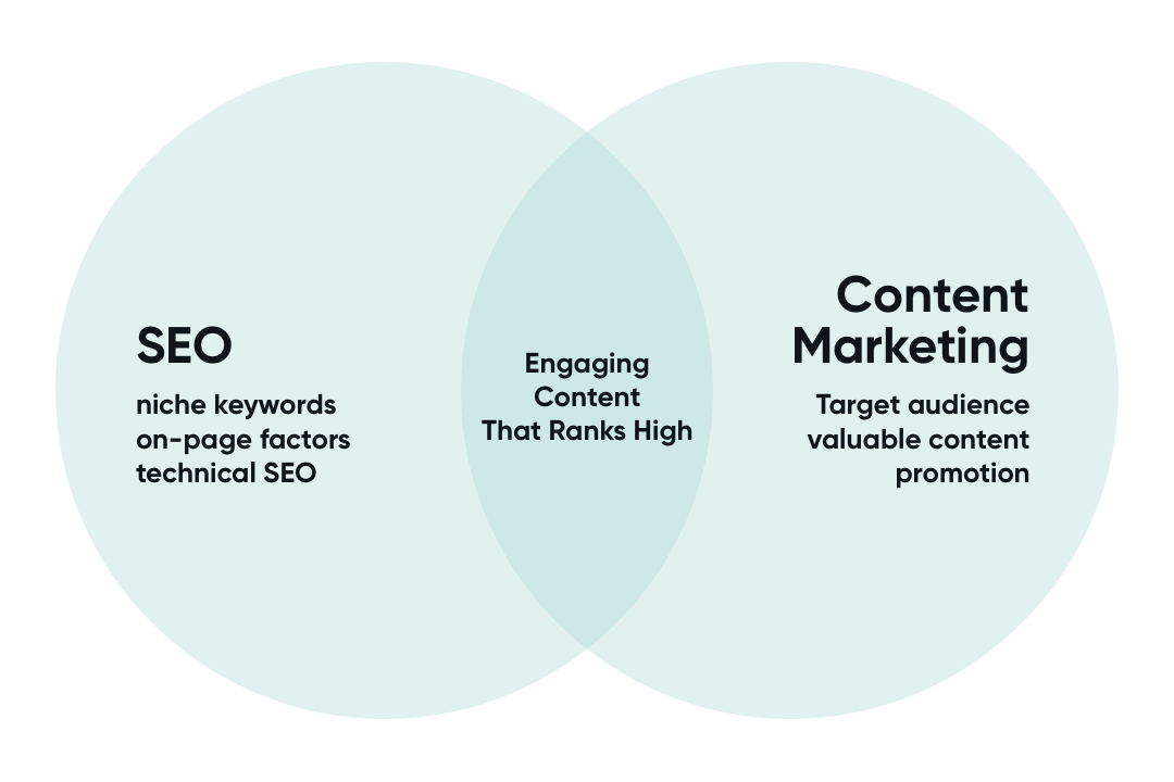 Ale gdzie w tym wszystkim SEO? Celem SEO jest tworzenie treści w dopasowaniu do algorytmów, które pozycjonują markę w rankingach wyszukiwarek internetowych. Z kolei celem content marketingu jest tworzenie wartościowych dla odbiorców treści. Często cel jednego i drugiego jest zbieżny, wtedy jesteś w stanie przygotowywać angażujące treści, które pozycjonują twoją markę wysoko (wykres powyżej). Jeśli jednak słowa kluczowe nie idą w parze z dostarczeniem pożądanych treści, powinieneś zastanowić się, czy chcesz tworzyć dla robota, czy dla człowieka, pamiętając o tym, że to właśnie człowiek jest twoją inwestycją.
